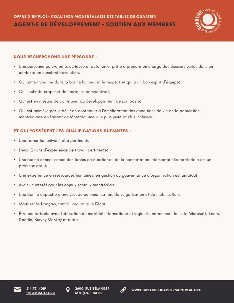 Nouvelles OFFRE D’EMPLOI Agent.e de développement – soutien aux membres mars 2026 mars 2026 COALITION MONTRÉALAISE DES TABLES DE QUARTIER – Poste à temps plein « Résister et réinventer » : deux jours de lumière au cœur d’un automne lancinant