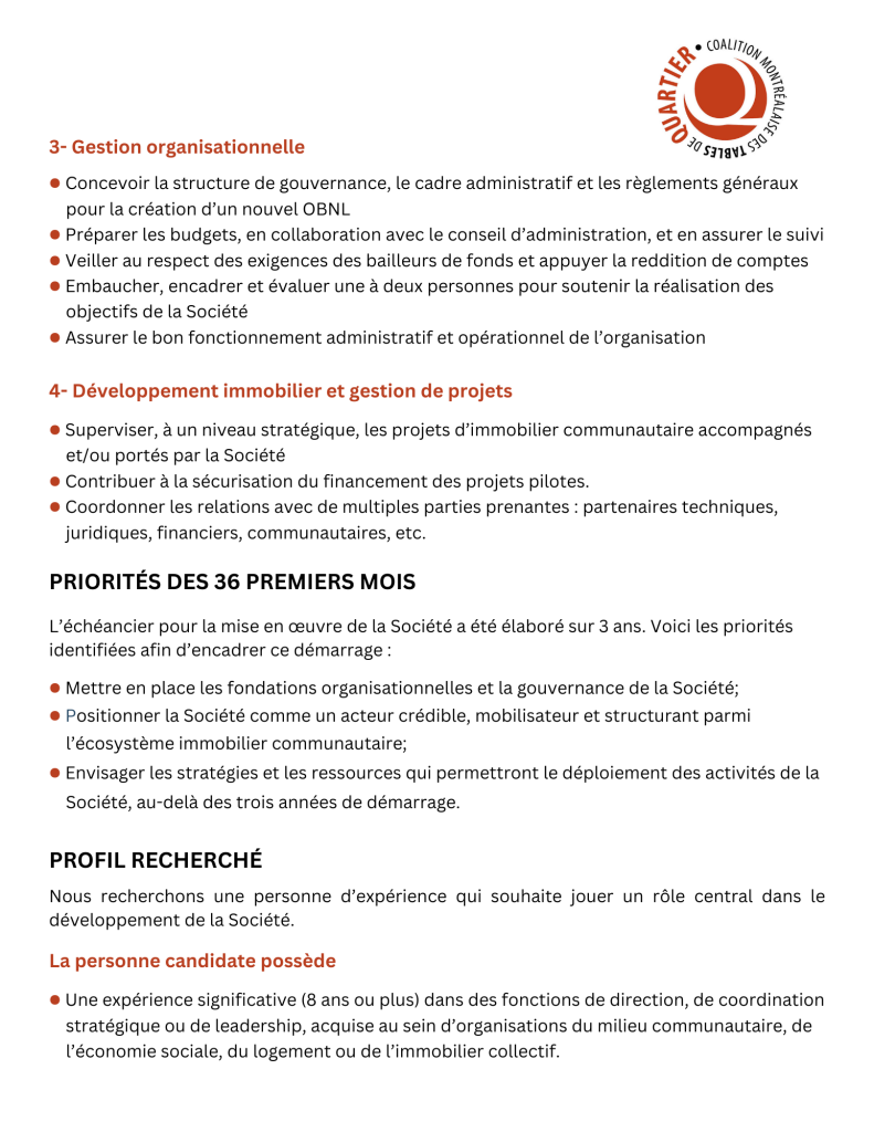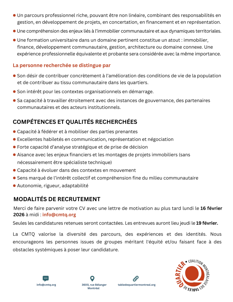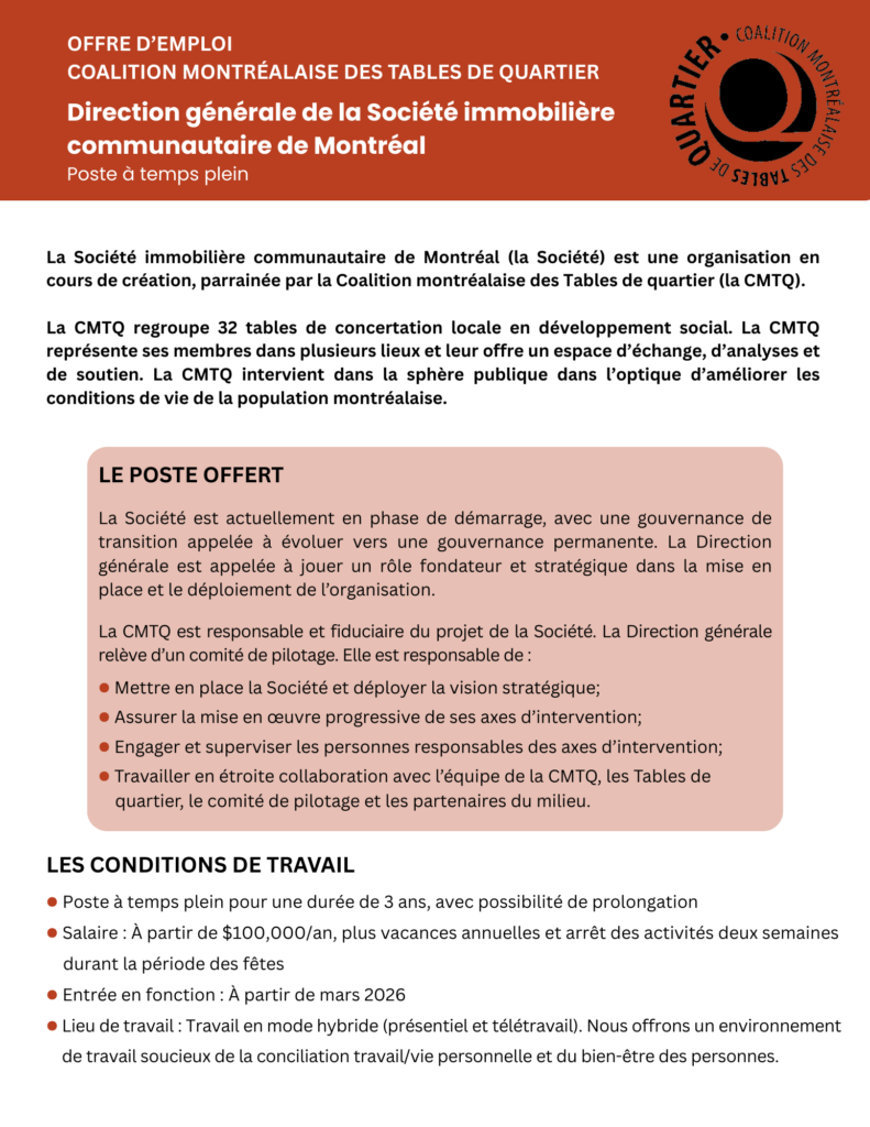 Nouvelles OFFRE D’EMPLOI Direction générale de la Société immobilière communautaire de Montréal janvier 2026 janvier 2026 COALITION MONTRÉALAISE DES TABLES DE QUARTIER – Poste à temps plein « Résister et réinventer » : deux jours de lumière au cœur d’un automne lancinant